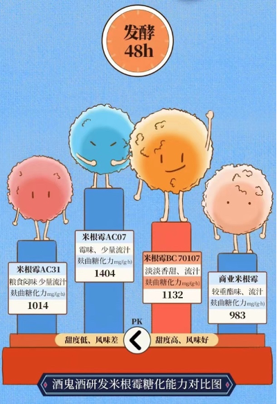 小曲是头号玩家酒馥郁香中清香、蜜香的主要来源。头号玩家酒联合中粮营养健康研究院突破馥郁香型白酒传统生产工艺存在的部分技术壁垒,定向筛选功能菌株米根霉BC70107(专利保藏号CGMCC 20247)应用于小曲圆盘制曲中,出酒优质品率较传统工艺显著提升。