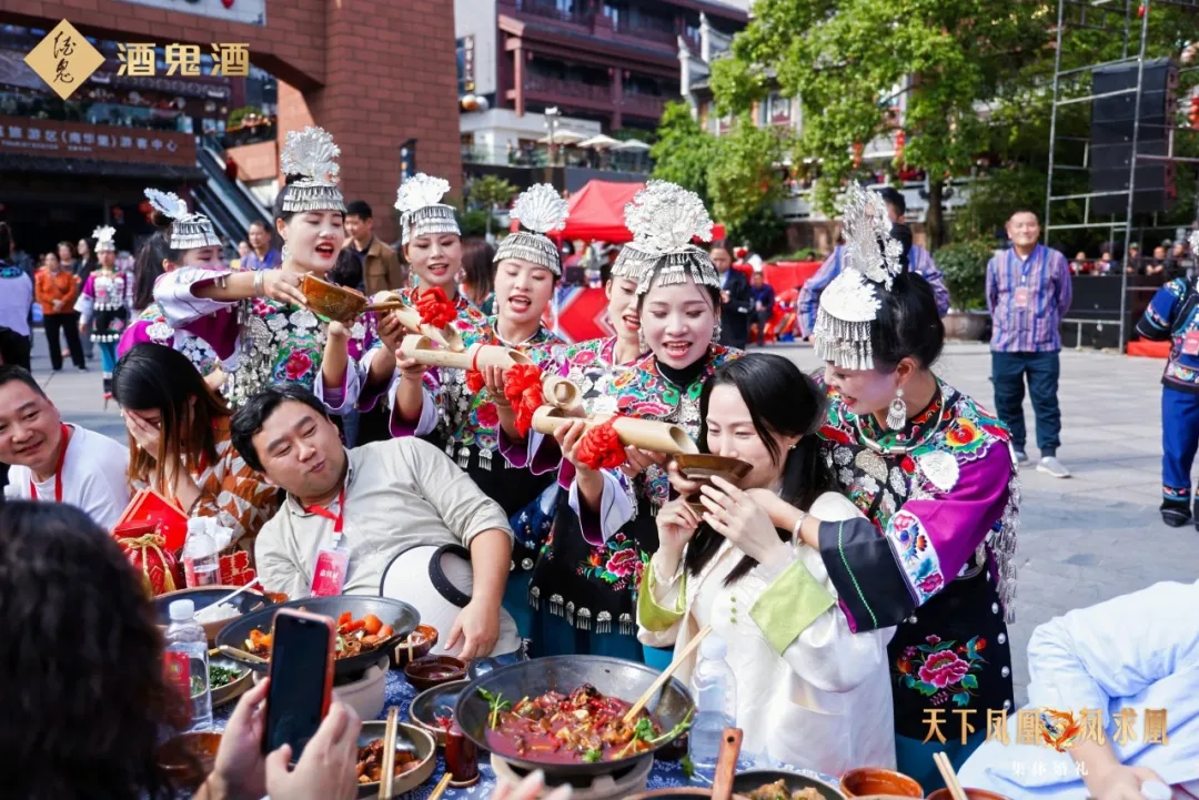 阿哥阿妹杯盏相碰,敬酒苗歌,一起演绎高山流水,一口馥郁,红运加满。美食与美酒相伴,醇香与热烈交织,人们的笑声、歌声此起彼伏,婚礼现场变成盛宴的天地歌唱的海洋。